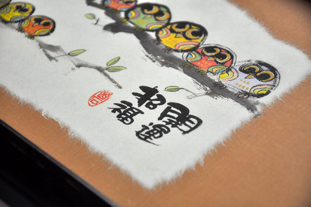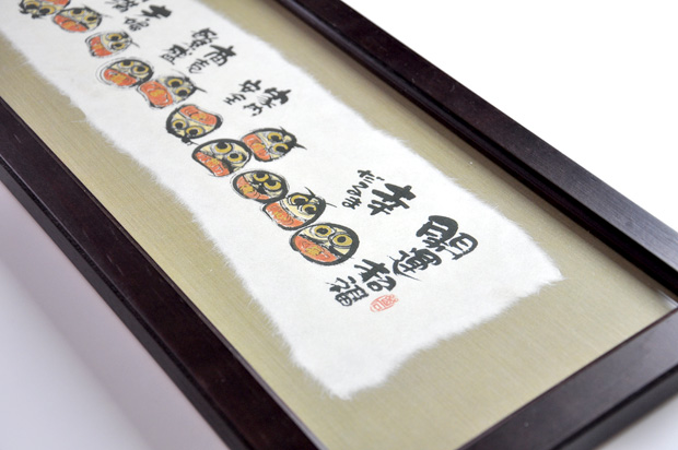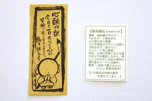 幸せの象徴である「だるま」「ふくろう」「七福神」をモチーフに、書家、デザイナーの【御木幽石 みきゆうせき】氏による、思わず笑顔になれる言葉が添えられています。